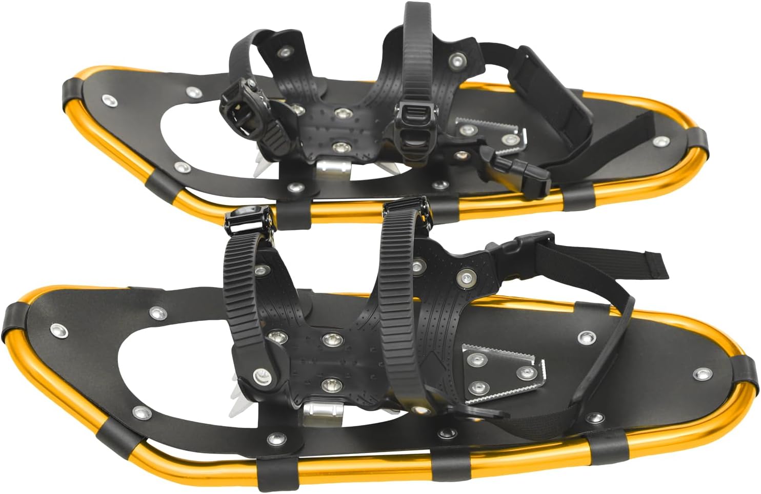 - ❄【Durable Materials】The snowshoes are made of high-quality PE, aluminum alloy, and stainless steel. The lightweight yet sturdy aluminum alloy frame is ergonomically designed for comfortable wear and smooth, flexible gliding on snow. Double ratchet buckles easily fit most shoe types for convenient on and off.