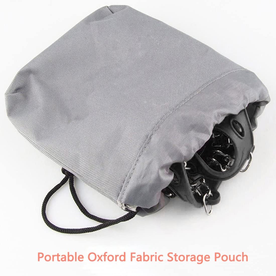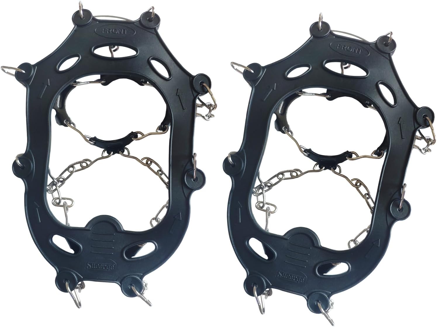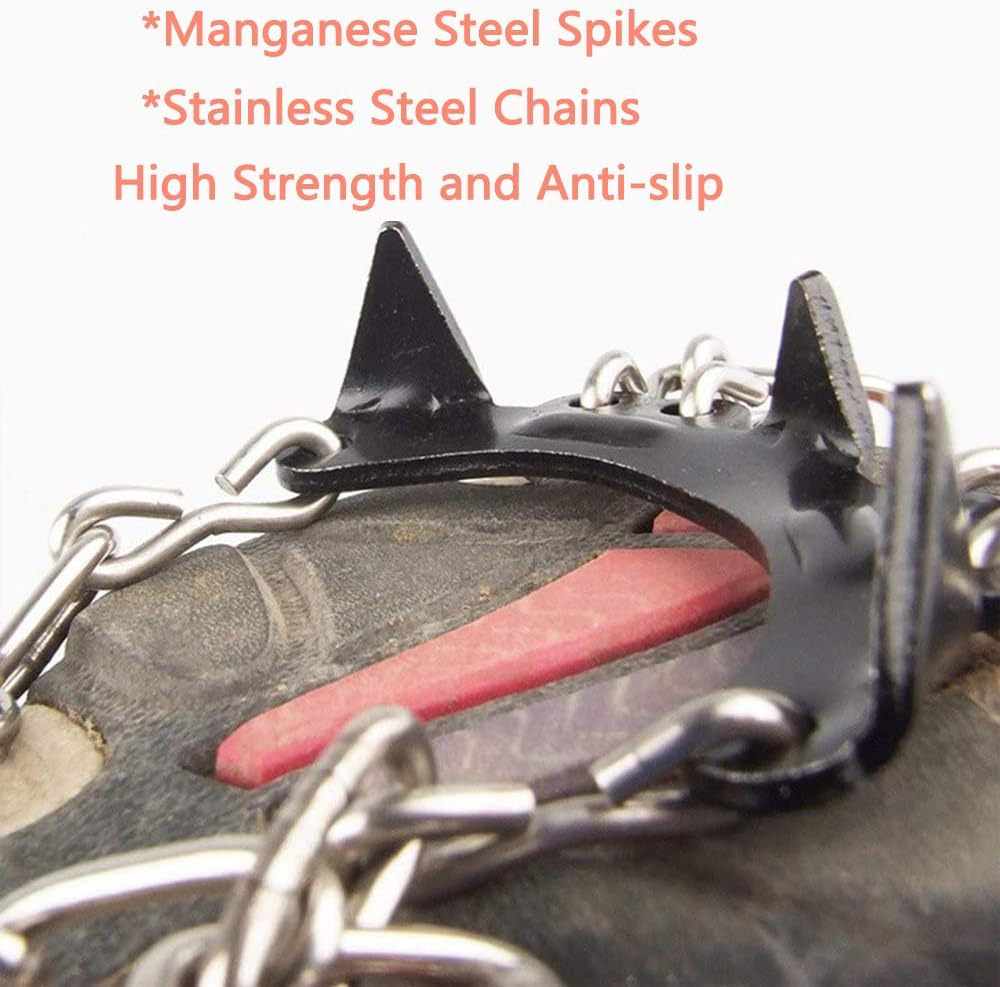- EASY AND COMFORTABLE TO WEAR: LINXGR 11 spikes crampons use super-tough rubber to better fit different size shoes. Easy putting on and taking off. Easy to stretch and tight fit with shoes. Double-breasted design, chain welding ensures firmness. Suitable for a variety of outdoor scenes, such as hiking and mountaineering, ice and snow, and mud roads.