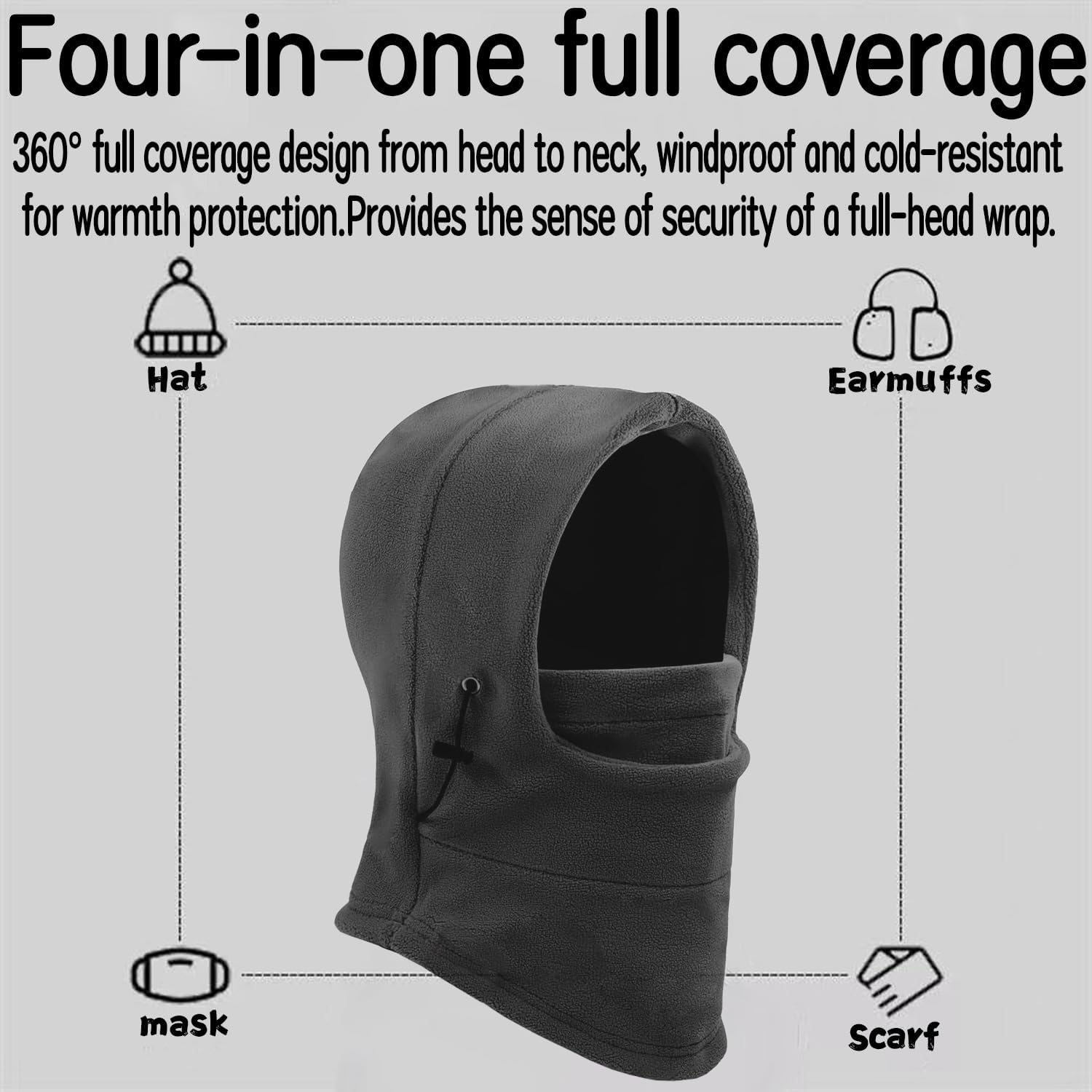 Side two sides of the adjustable contraction rope buckle design, adjust the size, easy to use, to better block the wind and snow into.